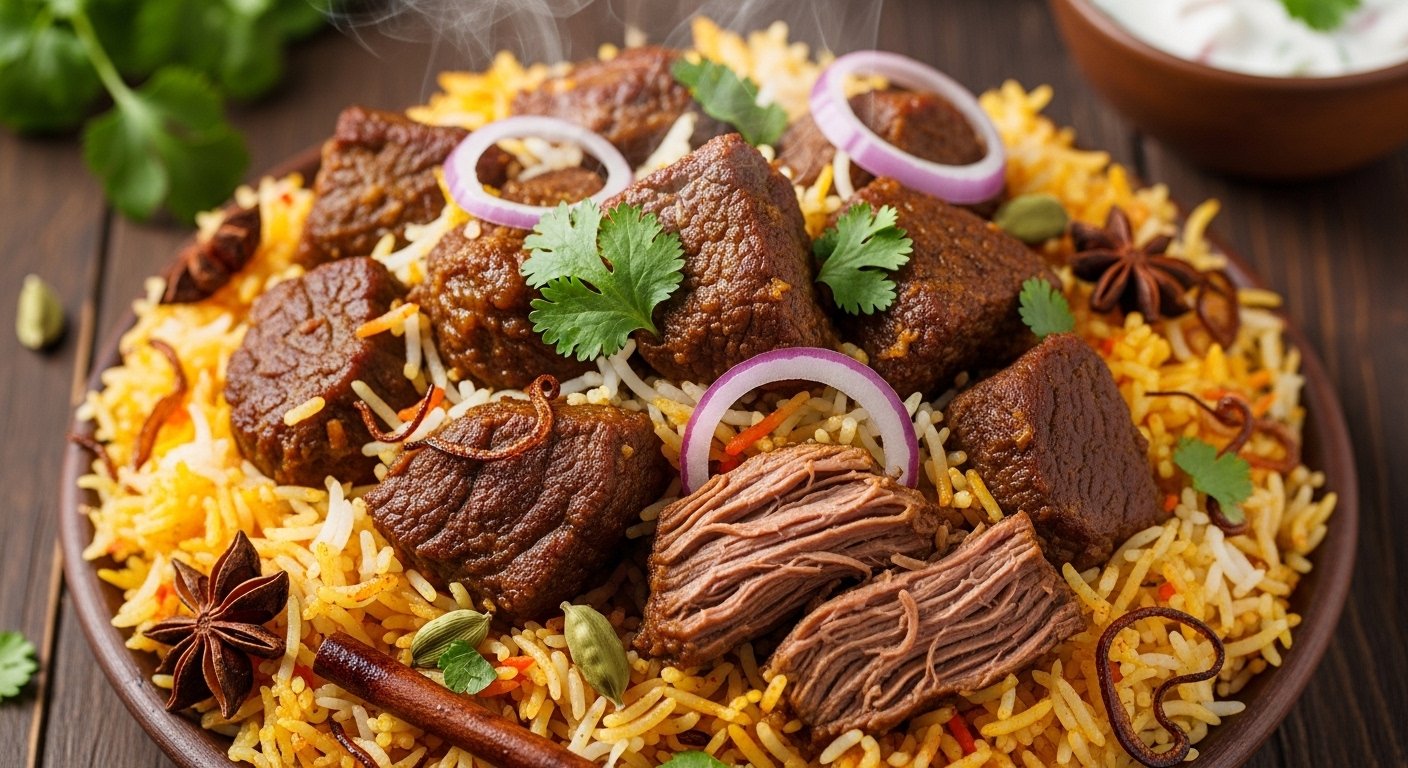 Tender beef chunks cooked to perfection with aromatic rice and traditional spices