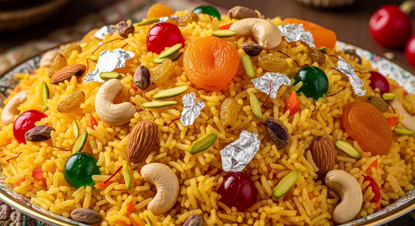 Traditional sweet rice dish infused with saffron, sugar, and garnished with nuts and dried fruits